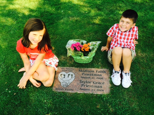 2. In August, we celebrated our girls’ 8-year-birthdays by bringing flowers to their spot. As we pulled up, Jacob grabbed the flowers and shouted, “I’ll carry these!” He hopped out of the car with enthusiasm and ran to a marker where he announced, “This looks like a good spot! I’ll leave them HERE!” It made me giggle, seeing him standing proudly on Tillie E. Cue’s headstone, ready to give her the flowers meant for his sisters.